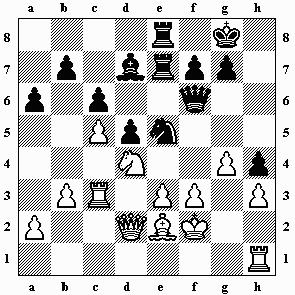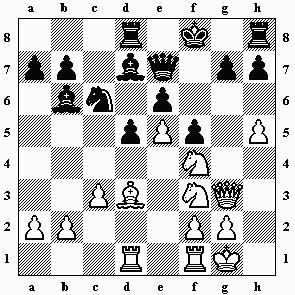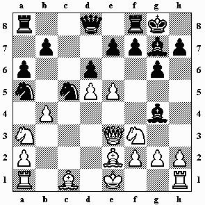 9.Lc3 Lh6 10.T3e2 Dd3 11.La1 Lxe4+ 12.Txe4 Kg8 13.Lxe5 dxe5 14.Txe5 Lf8 15.b5