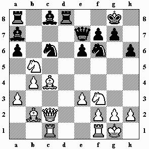 13.0–0 dxc4 14.Lxc4 b5?? Grober Fehler, obwohl die weiße Antwort nicht