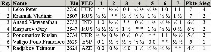 Schwarz gegen Kramnik! Das bedeutete den ersten Platz, punktegleich (aber mit besserer Zweitwertung) vor Kramnik, der als einziger Spieler keine Niederlage einstecken musste!