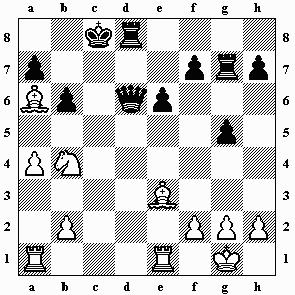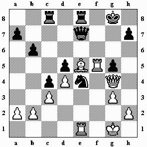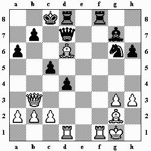 12.Lg2 e5 13.dxe5 Sxe5 14.Dd4 Sc6 15.Da4 a6 16.Lf4 h6 17.Tad1 g5 18.Lc1 d4? Mit diesem Zug beginnt die schwarze Katastrophe! Die Diagonale