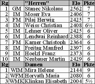 Eva Moser und Herwig Pilaj jeweils 6½ Punkte, gefolgt vom 8-fachen