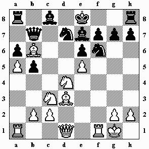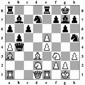 Ta7 7.De3 Tc7 8.Df4 Tb7 9.Dh6+ Kg8 10.Ld4 e5 11.Le3 Dd6 12.Lxb7 Lxb7 13.Td1 De6 Rublevsky