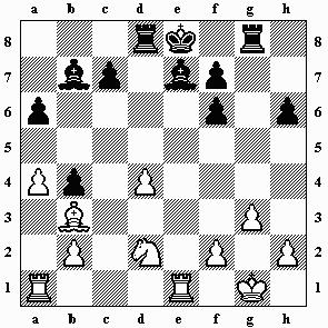 Lg4 10.h3 Lh5 11.d5 Sa5 12.Sa3 0–0 13.De2 c6 14.b4 cxd5 15.bxa5 Lxa5 16.Lg5