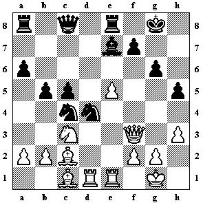 Variante: 16...Tc8 17.Dc2 Lxf3 18.Lxf3 Sxe5 19.Lb7 Tb8 20.Lxa6 Sc7 21.Lf4 Sd3